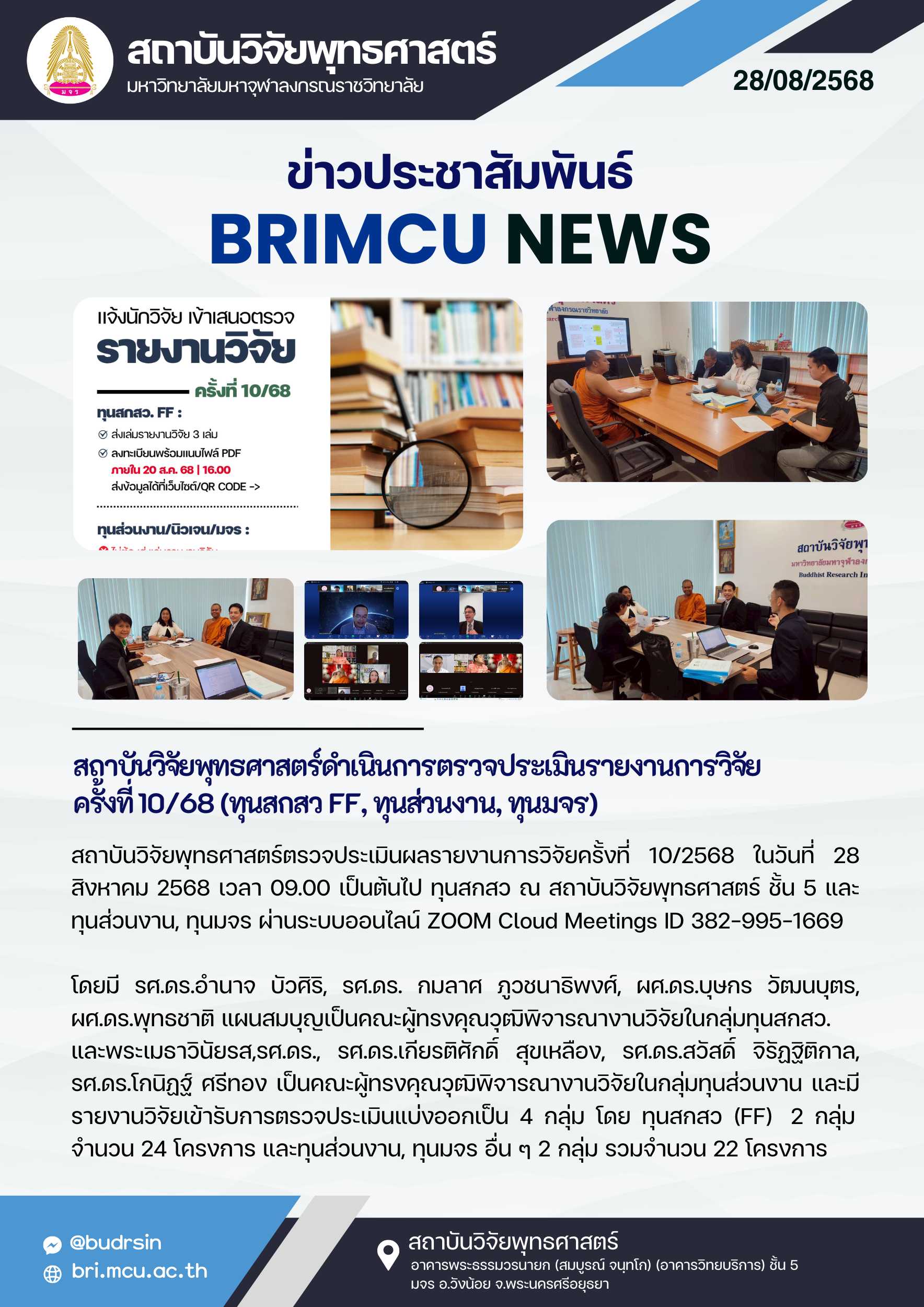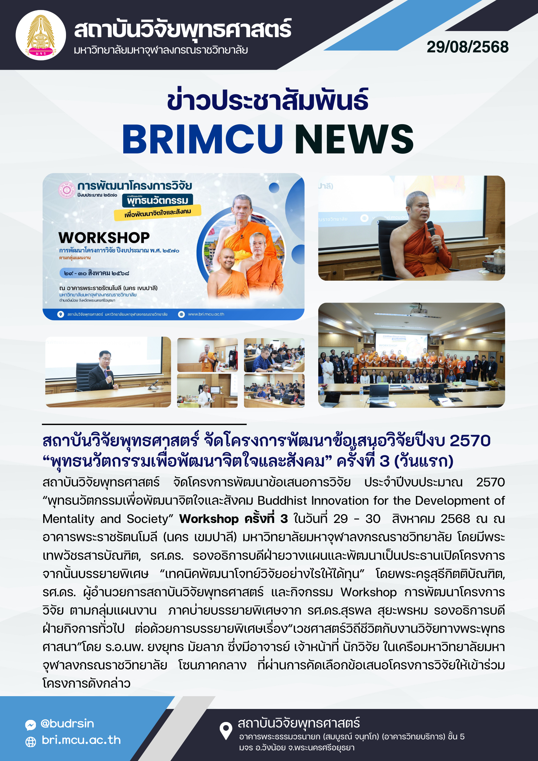 สถาบันวิจัยพุทธศาสตร์ จัดโครงการพัฒนาข้อเสนอการวิจัย ประจำปีงบประมาณ 2570 “พุทธนวัตกรรมเพื่อพัฒนาจิตใจและสังคม Buddhist Innovation for the Development of Mentality and Society” Workshop ครั้งที่ 3 ในวันที่ 29 –...