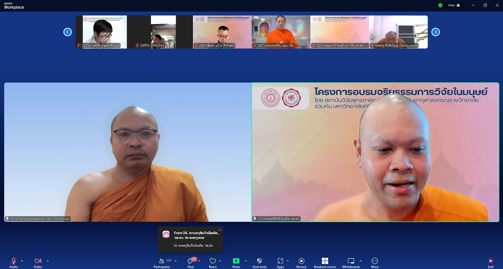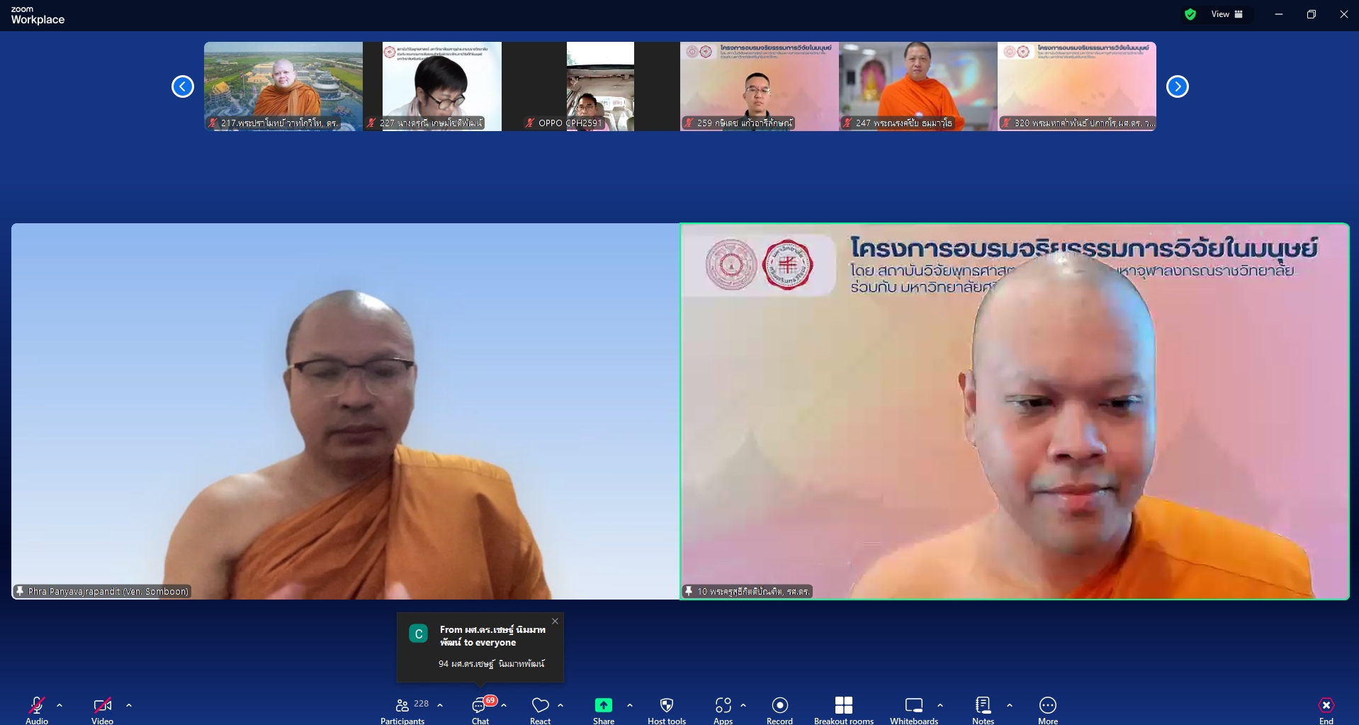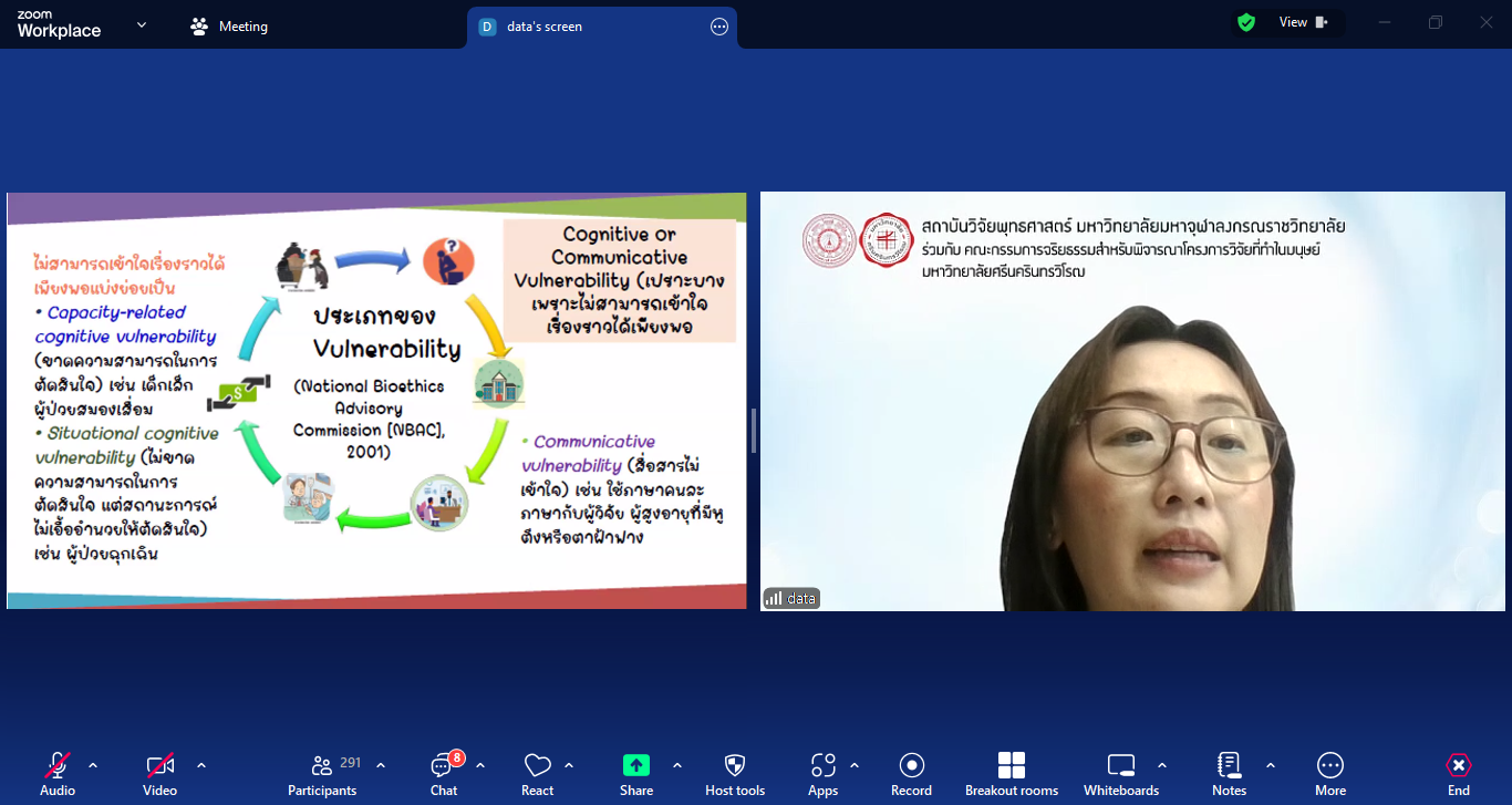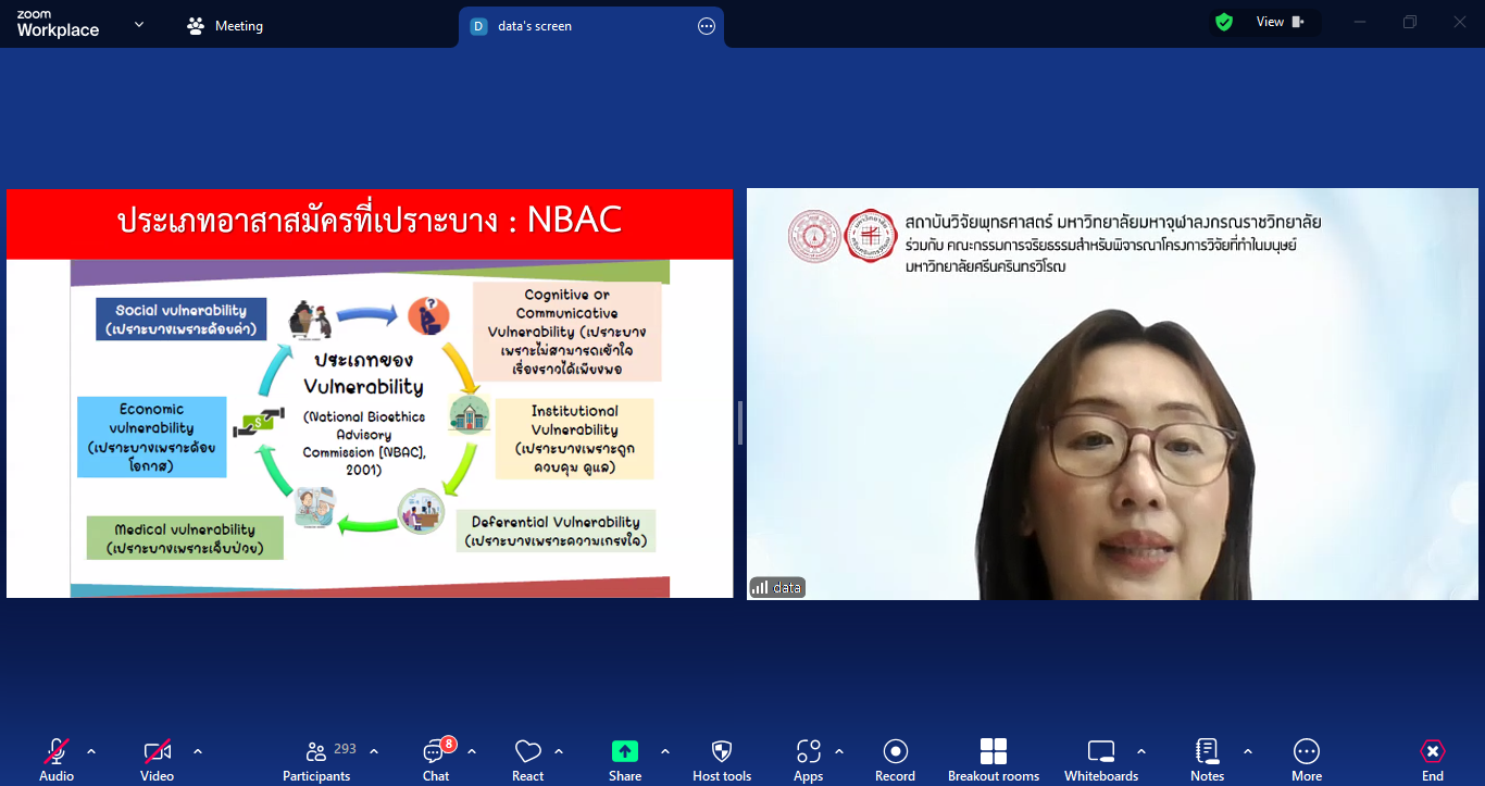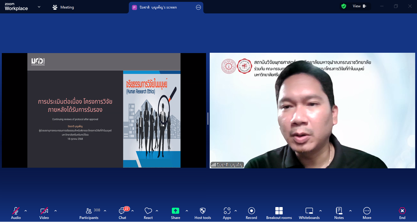 สถาบันวิจัยพุทธศาสตร์ มหาวิทยาลัยมหาจุฬาลงกรณราชวิทยาลัยร่วมกับ คณะกรรมการจริยธรรมสำหรับพิจารณาโครงการการวิจัยที่ทำในมนุษย์ มหาวิทยาลัยศรีนครินทรวิโรฒ จัดโครงการอบรมจริยธรรมการวิจัยในมนุษย์ด้านสังคมศาสตร์และพฤติกรรมศาสตร์ เรื่อง “หลักจริยธรรมการวิจัยในมนุษย์ หลักสูตรการปกป้องอาสาสมัคร (Human Subject Protection : HSP)” โดย ในวันที่ 18 ตุลาคม 2568 เวลา 08.00 – 17.00 น. ผ่านระบบออนไลน์ ZOOM โดยมีพระปัญญาวัชรบัณฑิต, รศ.ดร. รองอธิการบดีฝ่ายวิชาการ เป็นประธานเปิดการอบรม และมี พระครูสุธีกิตติบัณฑิต, รศ.ดร. ผู้อำนวยการสถาบันวิจัยพุทธศาสตร์ เป็นผู้กล่าวรายงาน และวิทยากรประกอบด้วย พ.ญ.สุรีพร ภัทรสุวรรณ, ศ.ดร.ฉัตรศรี เดชะปัญญา, รศ.ดร.สิทธิพงศ์ วัฒนานนท์สกุล, ผศ. ดร. ทพญ.ณปภา เอี่ยมจิรกุล, นายปิยชาติ บุญเพ็ญ ว่าด้วยเรื่องประวัติความเป็นมาและวิวัฒนาการของจริยธรรมการวิจัยในมนุษย์, บทบาทและหน้าที่ของคณะกรรมการจริยธรรมการวิจัยและผู้วิจัย, ผลประโยชน์ทับซ้อน และหลักการประเมินความเสี่ยงและผลประโยชน์ที่อาจจะได้รับ, ภาวะเปราะบาง กระบวนการขอความยินยอม หลักการรักษาความลับ, การประเมินต่อเนื่องของโครงการวิจัยที่ผ่านการรับรอง เป็นต้น ซึ่งมีผู้เข้าร่วมโครงการทั้งสิ้น 324 รูป/คน จากหน่วยงานในเครือมหาวิทยาลัยมหาจุฬาลงกรณราชวิทยาลัย และหน่วยงานภายนอก