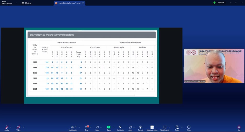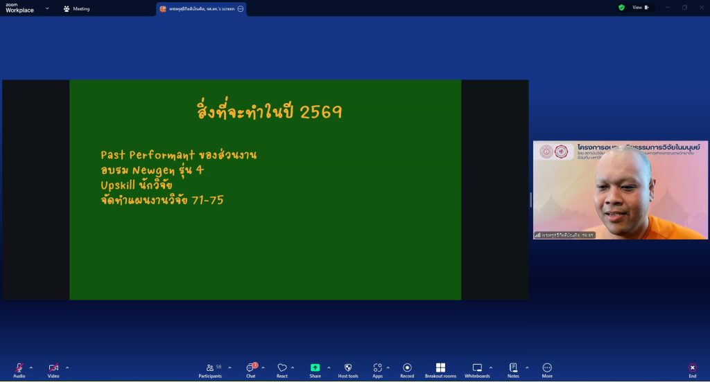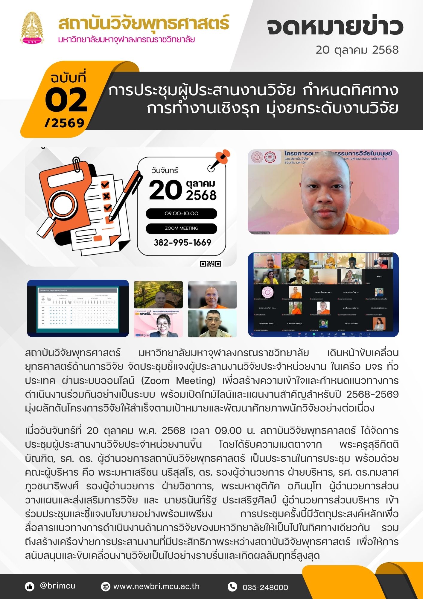 สถาบันวิจัยพุทธศาสตร์ มหาวิทยาลัยมหาจุฬาลงกรณราชวิทยาลัย เดินหน้าขับเคลื่อนยุทธศาสตร์ด้านการวิจัย จัดประชุมชี้แจงผู้ประสานงานวิจัยประจำหน่วยงาน ในเครือ มจร ทั่วประเทศ ผ่านระบบออนไลน์ (Zoom Meeting) เพื่อสร้างความเข้าใจและกำหนดแนวทางการดำเนินงานร่วมกันอย่างเป็นระบบ พร้อมเปิดไทม์ไลน์และแผนงานสำคัญสำหรับปี 2568-2569 มุ่งผลักดันโครงการวิจัยให้สำเร็จตามเป้าหมายและพัฒนาศักยภาพนักวิจัยอย่างต่อเนื่อง