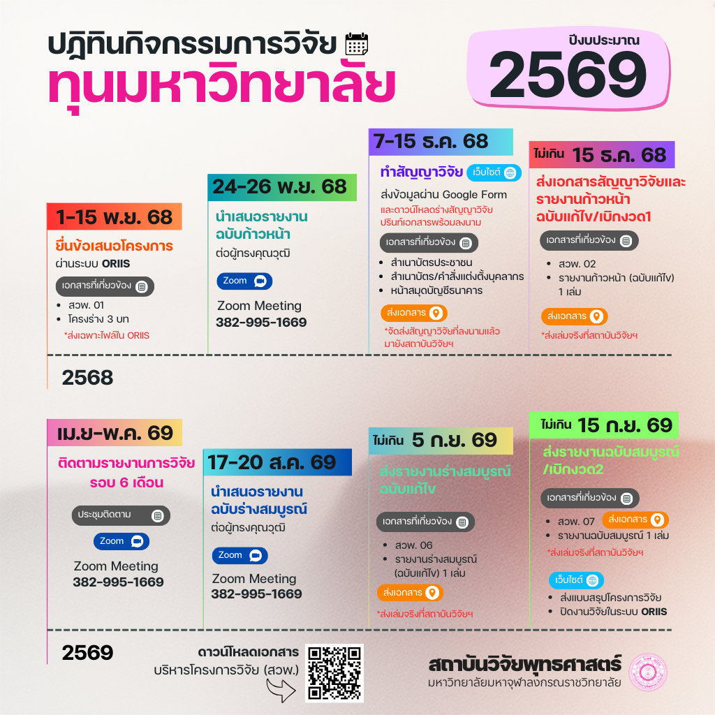 ปฏิทินกิจกรรมการวิจัย ทุนมหาวิทยาลัย ปีงบประมาณ 2569By สถาบันวิจัยพุทธศาสตร์ / 10/11/2025 ปฏิทินกิจกรรมการวิจัย ทุนมหาวิทยาลัย ปีงบประมาณ 2569 Post Views: 202