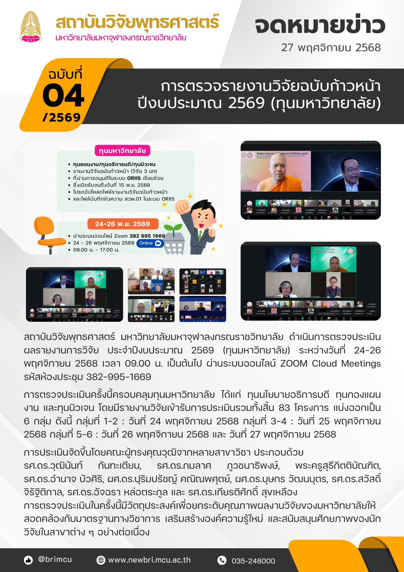 สถาบันวิจัยพุทธศาสตร์ มหาวิทยาลัยมหาจุฬาลงกรณราชวิทยาลัย ดำเนินการตรวจประเมินผลรายงานการวิจัย ประจำปีงบประมาณ 2569 (ทุนมหาวิทยาลัย) ระหว่างวันที่ 24–26 พฤศจิกายน 2568 เวลา 09.00 น. เป็นต้นไป ผ่านระบบออนไลน์ ZOOM Cloud Meetings รหัสห้องประชุม 382-995-1669
