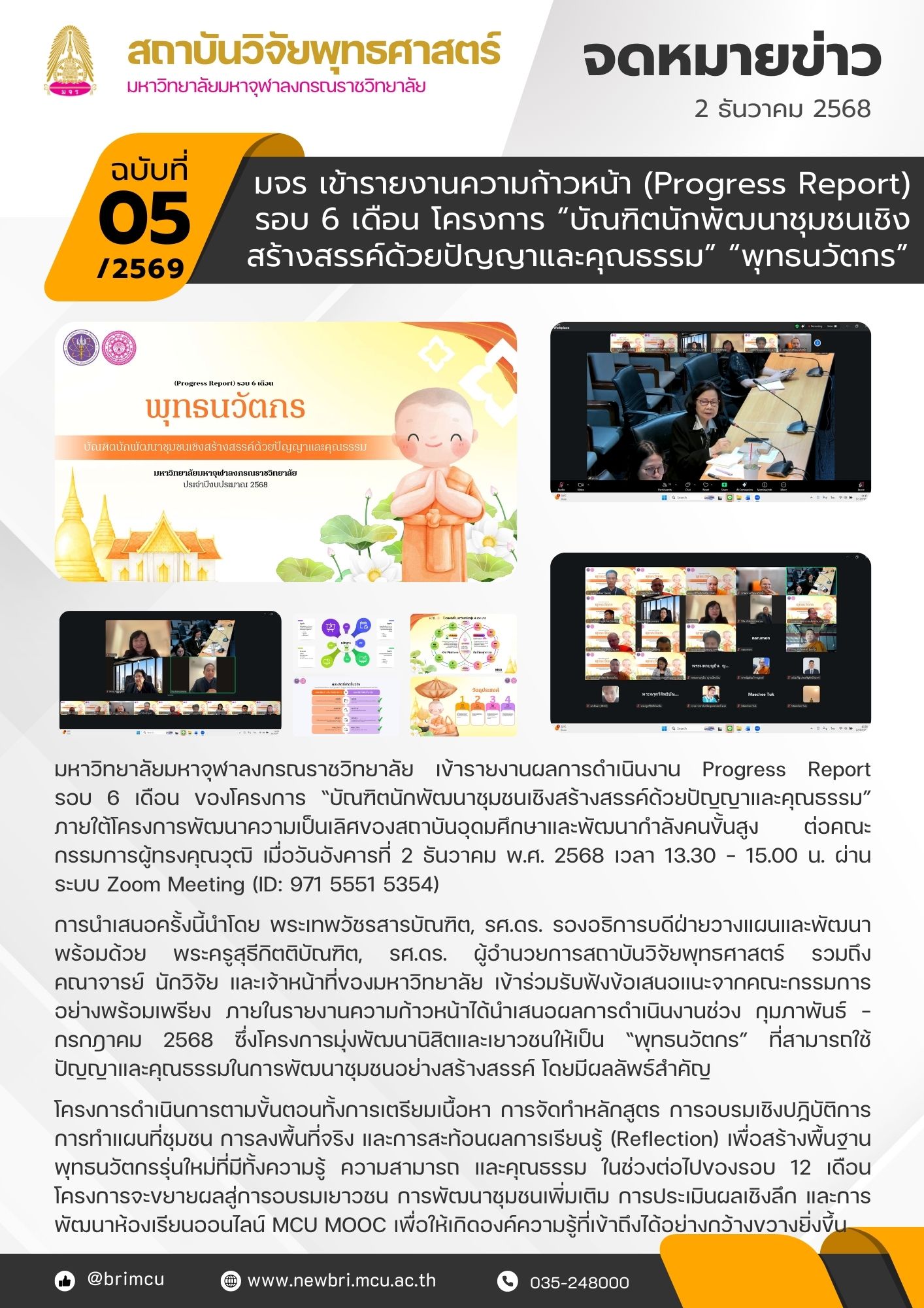 มหาวิทยาลัยมหาจุฬาลงกรณราชวิทยาลัย เข้ารายงานผลการดำเนินงาน Progress Report รอบ 6 เดือน ของโครงการ “บัณฑิตนักพัฒนาชุมชนเชิงสร้างสรรค์ด้วยปัญญาและคุณธรรม” ภายใต้โครงการพัฒนาความเป็นเลิศของสถาบันอุดมศึกษาและพัฒนากำลังคนขั้นสูง ต่อคณะกรรมการผู้ทรงคุณวุฒิ เมื่อวันอังคารที่ 2 ธันวาคม พ.ศ. 2568 เวลา 13.30 – 15.00 น. ผ่านระบบ Zoom Meeting (ID: 971 5551 5354)