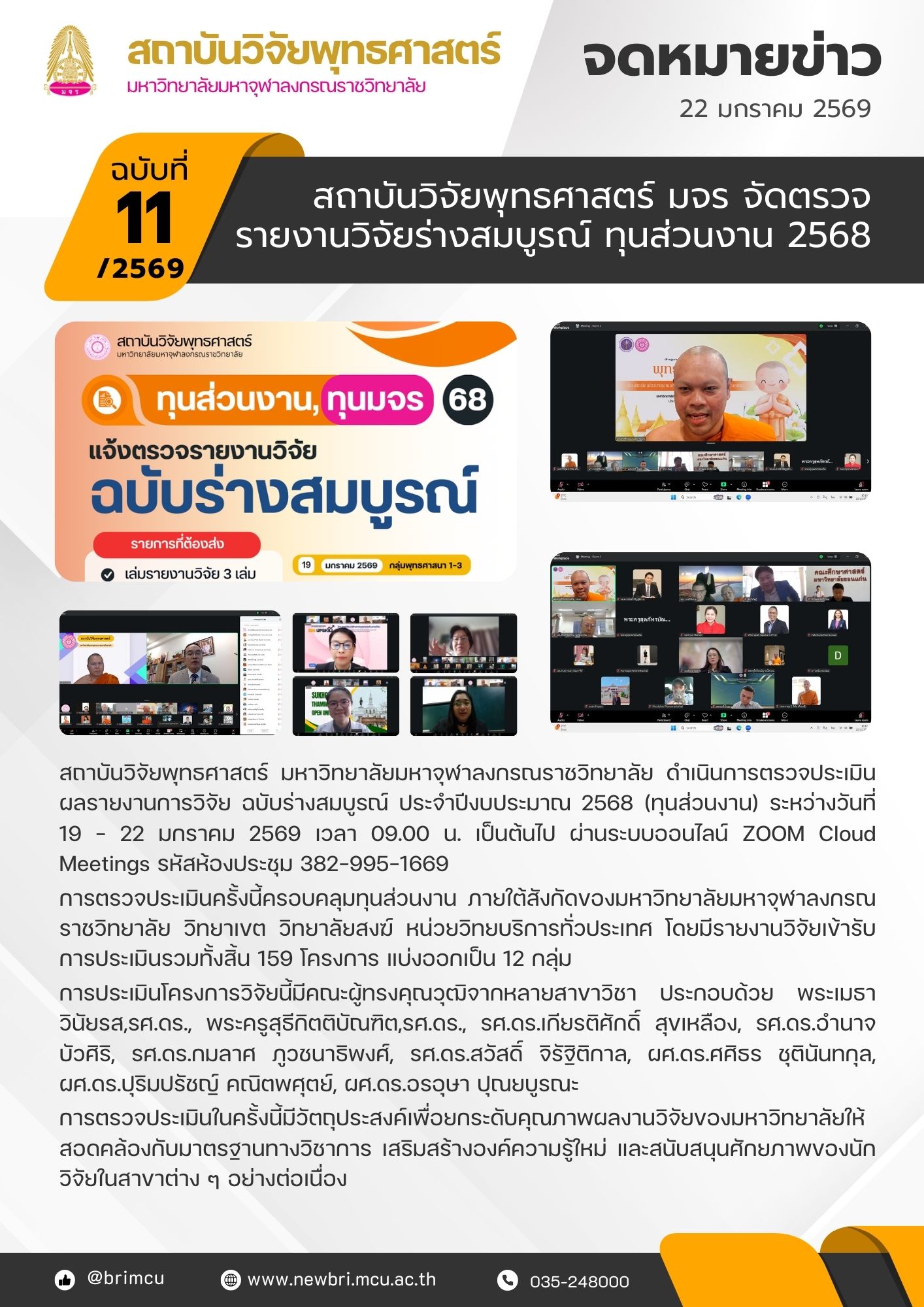 สถาบันวิจัยพุทธศาสตร์ มหาวิทยาลัยมหาจุฬาลงกรณราชวิทยาลัย ดำเนินการตรวจประเมินผลรายงานการวิจัย ฉบับร่างสมบูรณ์ ประจำปีงบประมาณ 2568 (ทุนส่วนงาน) ระหว่างวันที่ 19 – 22 มกราคม 2569 เวลา 09.00 น. เป็นต้นไป ผ่านระบบออนไลน์ ZOOM Cloud Meetings รหัสห้องประชุม 382-995-1669