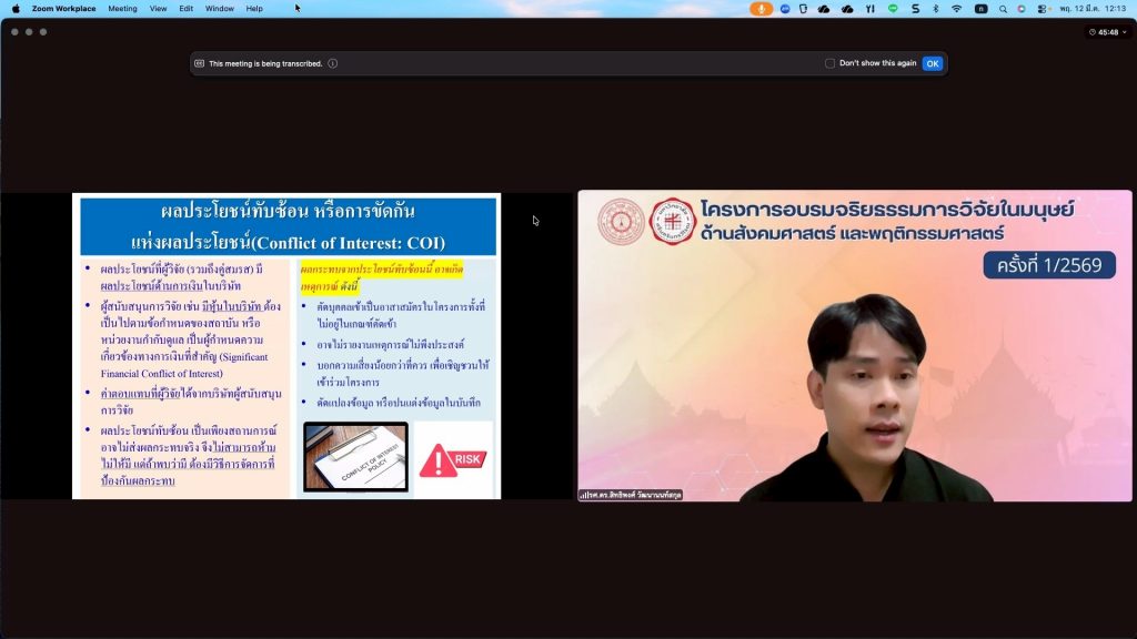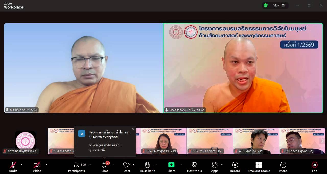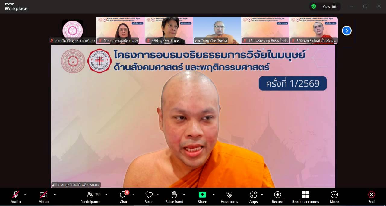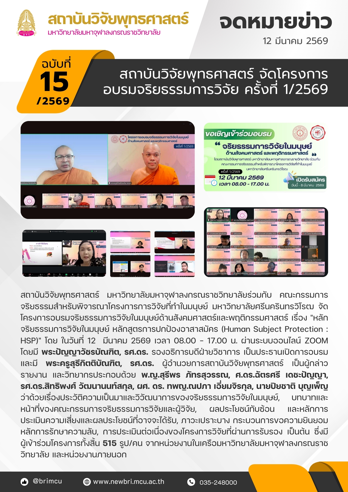 สถาบันวิจัยพุทธศาสตร์ มหาวิทยาลัยมหาจุฬาลงกรณราชวิทยาลัยร่วมกับ คณะกรรมการจริยธรรมสำหรับพิจารณาโครงการการวิจัยที่ทำในมนุษย์ มหาวิทยาลัยศรีนครินทรวิโรฒ จัดโครงการอบรมจริยธรรมการวิจัยในมนุษย์ด้านสังคมศาสตร์และพฤติกรรมศาสตร์ เรื่อง “หลักจริยธรรมการวิจัยในมนุษย์ หลักสูตรการปกป้องอาสาสมัคร (Human Subject Protection : HSP)” โดย ในวันที่ 12 มีนาคม 2569 เวลา 08.00 – 17.00 น. ผ่านระบบออนไลน์ ZOOM