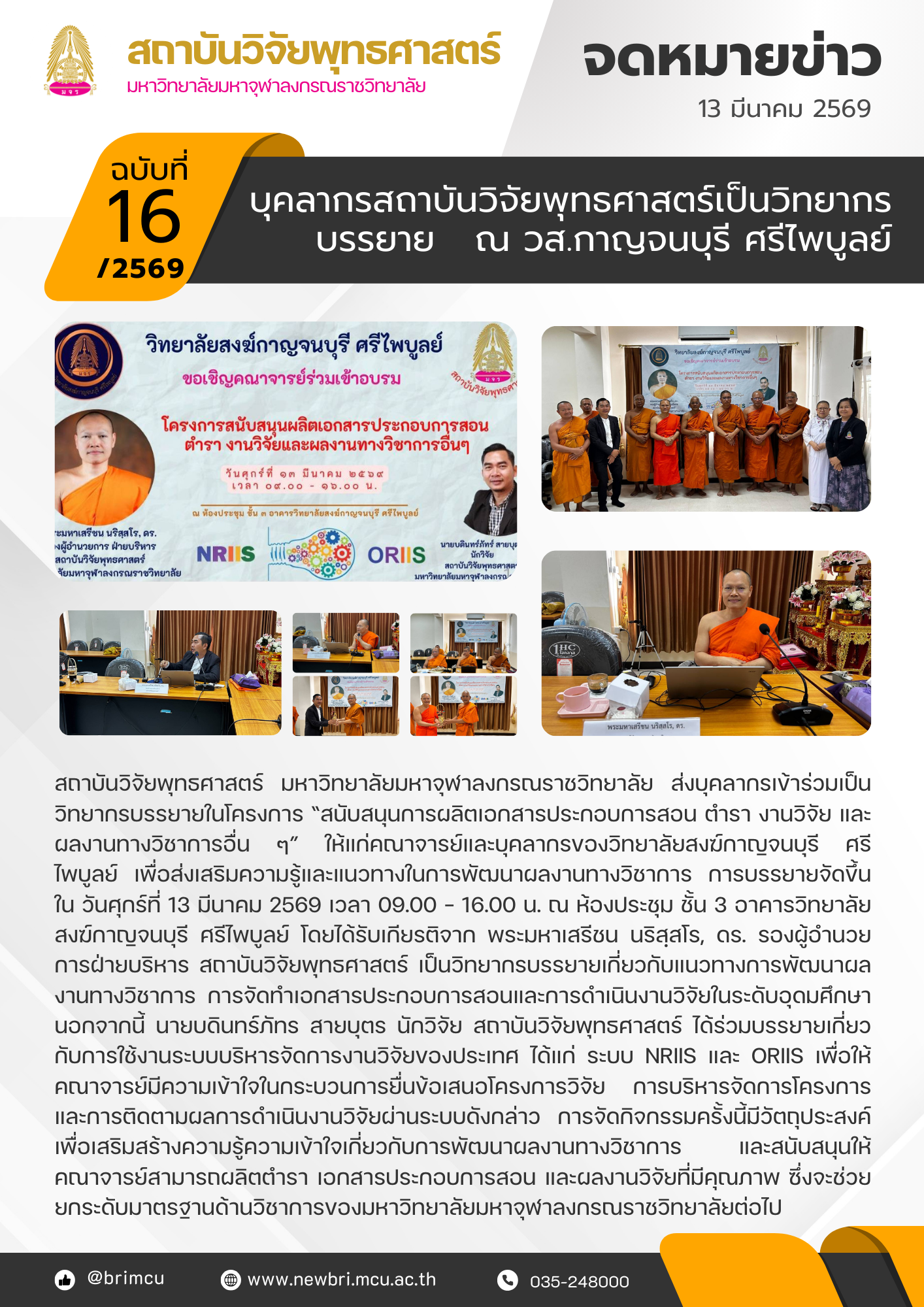 สถาบันวิจัยพุทธศาสตร์ มหาวิทยาลัยมหาจุฬาลงกรณราชวิทยาลัย ส่งบุคลากรเข้าร่วมเป็นวิทยากรบรรยายในโครงการ “สนับสนุนการผลิตเอกสารประกอบการสอน ตำรา งานวิจัย และผลงานทางวิชาการอื่น ๆ” ให้แก่คณาจารย์และบุคลากรของวิทยาลัยสงฆ์กาญจนบุรี ศรีไพบูลย์ เพื่อส่งเสริมความรู้และแนวทางในการพัฒนาผลงานทางวิชาการ การบรรยายจัดขึ้นใน วันศุกร์ที่ 13 มีนาคม 2569 เวลา 09.00 – 16.00 น. ณ ห้องประชุม ชั้น 3 อาคารวิทยาลัยสงฆ์กาญจนบุรี ศรีไพบูลย์