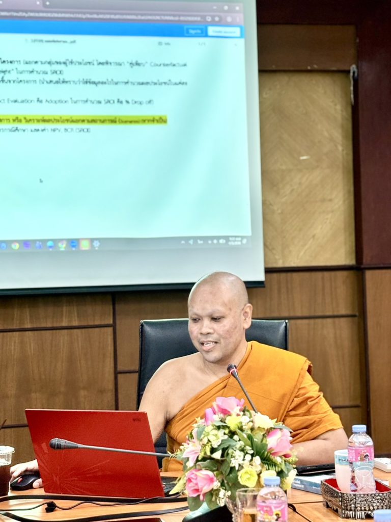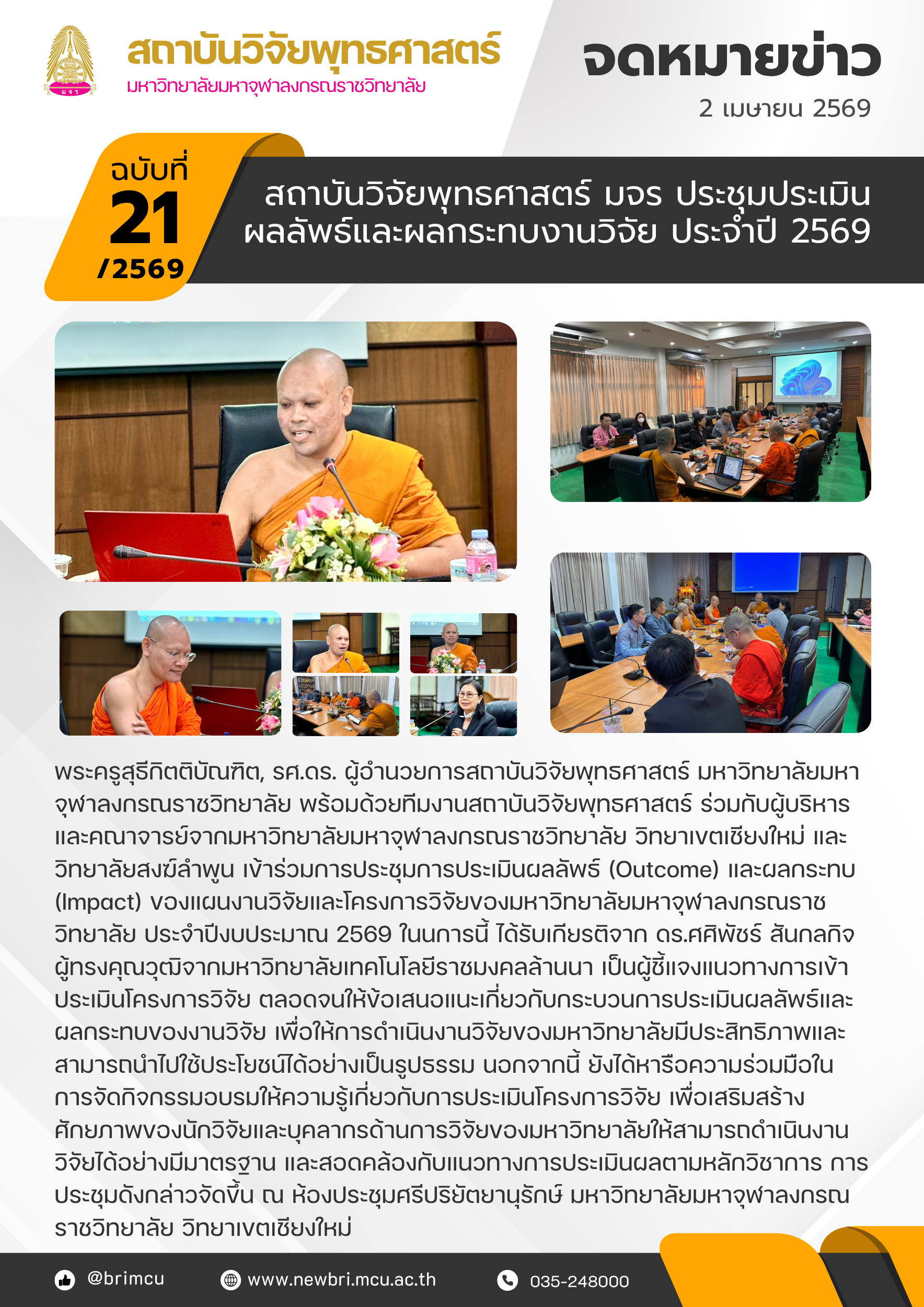 พระครูสุธีกิตติบัณฑิต, รศ.ดร. ผู้อำนวยการสถาบันวิจัยพุทธศาสตร์ มหาวิทยาลัยมหาจุฬาลงกรณราชวิทยาลัย พร้อมด้วยทีมงานสถาบันวิจัยพุทธศาสตร์ ร่วมกับผู้บริหารและคณาจารย์จากมหาวิทยาลัยมหาจุฬาลงกรณราชวิทยาลัย วิทยาเขตเชียงใหม่ และวิทยาลัยสงฆ์ลำพูน เข้าร่วมการประชุมการประเมินผลลัพธ์ (Outcome) และผลกระทบ (Impact) ของแผนงานวิจัยและโครงการวิจัยของมหาวิทยาลัยมหาจุฬาลงกรณราชวิทยาลัย ประจำปีงบประมาณ 2569 ในนการนี้ ได้รับเกียรติจาก ดร.ศศิพัชร์ สันกลกิจ ผู้ทรงคุณวุฒิจากมหาวิทยาลัยเทคโนโลยีราชมงคลล้านนา เป็นผู้ชี้แจงแนวทางการเข้าประเมินโครงการวิจัย ตลอดจนให้ข้อเสนอแนะเกี่ยวกับกระบวนการประเมินผลลัพธ์และผลกระทบของงานวิจัย เพื่อให้การดำเนินงานวิจัยของมหาวิทยาลัยมีประสิทธิภาพและสามารถนำไปใช้ประโยชน์ได้อย่างเป็นรูปธรรม นอกจากนี้ ยังได้หารือความร่วมมือในการจัดกิจกรรมอบรมให้ความรู้เกี่ยวกับการประเมินโครงการวิจัย เพื่อเสริมสร้างศักยภาพของนักวิจัยและบุคลากรด้านการวิจัยของมหาวิทยาลัยให้สามารถดำเนินงานวิจัยได้อย่างมีมาตรฐาน และสอดคล้องกับแนวทางการประเมินผลตามหลักวิชาการ การประชุมดังกล่าวจัดขึ้น ณ ห้องประชุมศรีปริยัตยานุรักษ์ มหาวิทยาลัยมหาจุฬาลงกรณราชวิทยาลัย วิทยาเขตเชียงใหม่